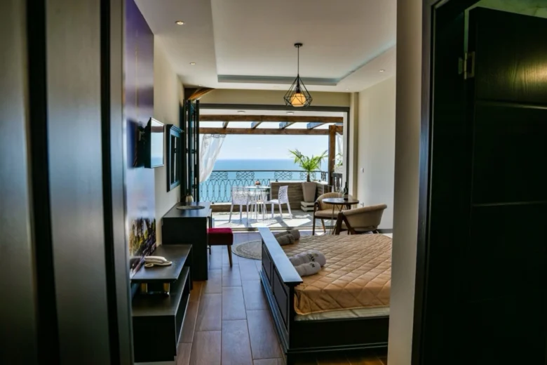 This double room’s special features are the pool with a view and the fireplace. The spacious double room provides air conditioning, a private entrance, a terrace with sea views as well as a private bathroom featuring a walk-in shower. The unit offers 1 bed.